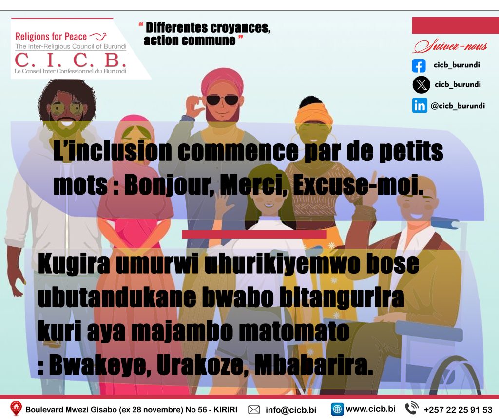 Au Conseil Interconfessionnel du Burundi (CICB), nous croyons que chaque geste de courtoisie contribue à créer un environnement inclusif où chacun se sent respecté et valorisé. L’inclusion n’est pas seulement un concept : elle commence par des actions concrètes et quotidiennes.